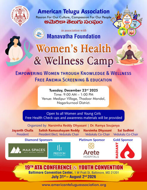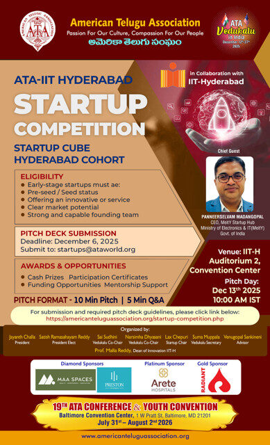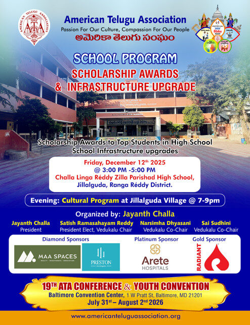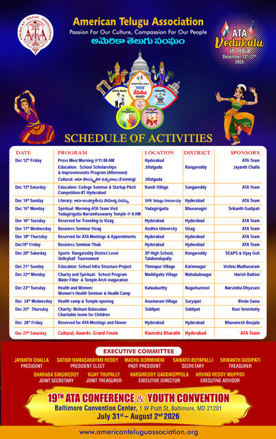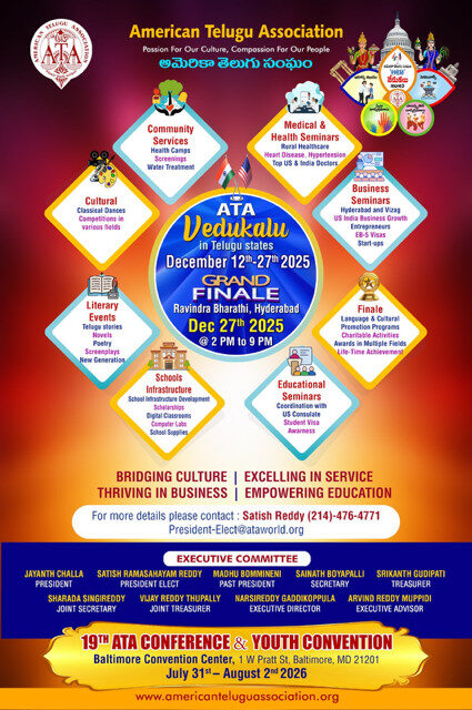 ATA is set to host its flagship annual cultural and service festival, ATA Vedukalu 2025, across Telangana and Andhra Pradesh from December 12 to December 27, 2025. Over the past two decades, ATA Vedukalu has grown into a global movement dedicated to promoting Telugu language, arts, and traditions, while also driving meaningful social change through education and health programs.