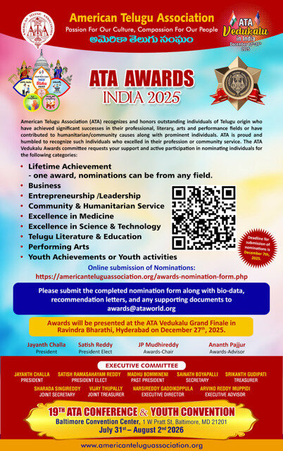 As part of ATA Vedukalu, the ATA Awards – India 2025 will recognize exceptional individuals of Telugu origin who have made outstanding contributions in their respective fields and in community service. The awards ceremony will be held on December 27, 2025, at Ravindra Bharathi, Hyderabad.