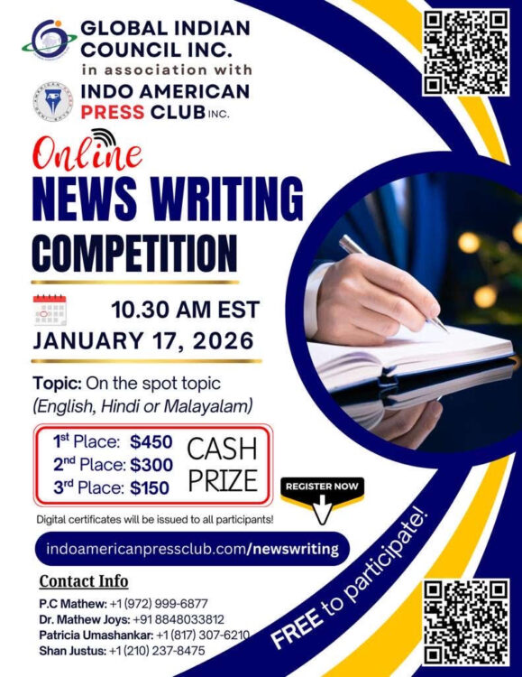 The Global Indian Council (GIC), a United States–based non-profit organization representing the global Indian diaspora, in collaboration with the Indo American Press Club (IAPC), has announced the launch of the Global Online News Writing Contest 2026, a worldwide initiative designed to promote ethical journalism, original reporting, and critical thinking among aspiring and established writers.