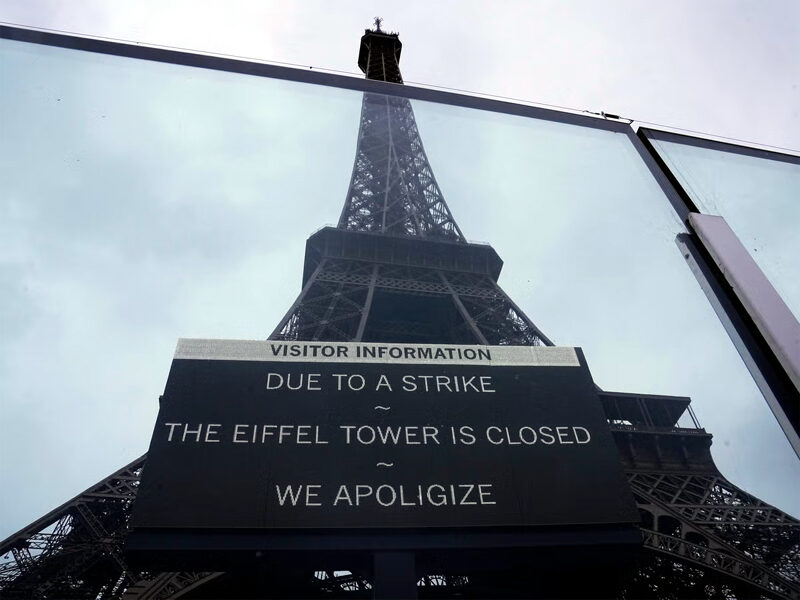 Protests spread across more than 200 French cities, with nearly 200,000 people estimated to have taken to the streets. The Interior Ministry reported around 24,000 protesters in Paris alone. In response, officials placed a sign at the tower entrance: “Due to a strike, the Eiffel Tower is closed. We apologize.”